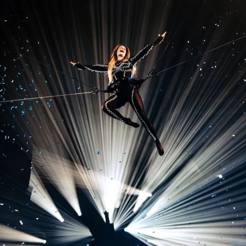 Davina Michelle eye-catcher at the Dutch Vrienden van Amstel event, flying through the Ahoy Arena in Rotterdam.
